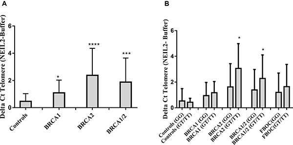 Figure 3: (A) Comparative analysis of the relative number of NEIL2-lesions found at telomeres according BRCA mutational status in FBOC series (BRCA1 and BRCA2 mutation carriers are compared with Controls). (B) Comparative analysis of the relative amount of “NEIL2-lesions” found at telomeres according the SNP status ((Carriers (GT/TT) Vs Non-carriers (GG)) among the different BRCA mutational groups in FBOC series (BRCA1, BRCA2 mutation carriers and BRCA1/BRCA2 non-carrier Controls). Unpaired student t test was used to test for potential significant differences. (*p < 0.05, **p < 0.01, ***p < 0.001, ****p < 0.0001).