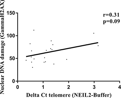 Figure 4: Correlation analysis between relative amount of “NEIL2-lesions” and the γH2AX nuclear intensity signal (DSBs). Spearman test, was used to test whether correlation is significant. significant p-value when (p < 0.05).