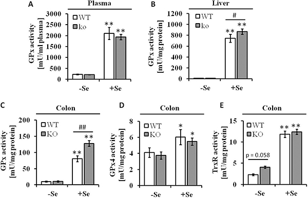 Figure 1: Se status following eight weeks of feeding with different Se concentrations. Enzyme activities of (A) GPx in plasma, (B) GPx in liver and (C) in colon lysates, (D) GPx4 and (E) TrxR in colon tissues were spectrophotometrically determined as described in the Material and Methods section. Values are given as means ± S.E.M. (n = 9). Significant differences were calculated by one-way ANOVA. *p < 0.05; **p < 0.01 vs. the respective -Se group; ##p < 0.01 WT vs. KO within the same Se supply level.