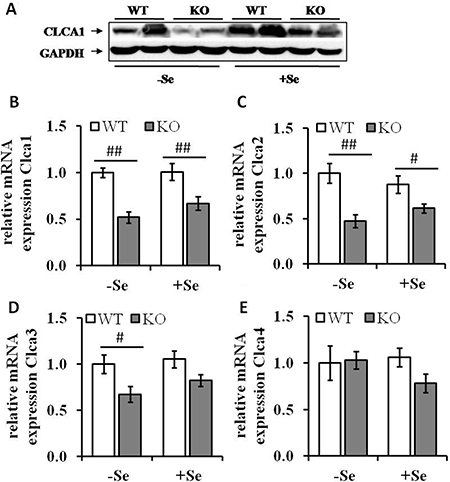 CLCA1 represents a multifunctional protein and has been linked to various diseases with mucus overproduction, including cystic fibrosis, asthma and chronic obstructive disease [34, 36–38]. Common features of these diseases are goblet cell hyperplasia, enhanced mucus production and increased expression levels of Clca1. As CLCA1 is secreted by goblet cells together with Muc2 in the GIT [39, 40], it might be involved in the regulation of mucus production and/or goblet cell formation. However, the histological analysis of colon tissues of -SeKO mice showed a marked increase in goblet cell numbers and an induced Muc2 mRNA expression level, but surprisingly low levels of Clca1 expression. Furthermore, in the GPx2 knockout group fed with the +Se diet the reduced Clca1 expression had no impact at all on the goblet cell formation process. Thus, Clca1 expression levels obviously neither correlate with the total goblet cell number nor with the Muc2 expression level in GPx2 KO mice. In addition, CLCA1 expression was rather restricted to goblet cells located in the upper part of the crypts, whereas the high number of goblet cells located at the crypt base observed in the GPx2 KO group maintained on -Se conditions fully lack CLCA1 expression. The authors thus hypothesize that under -SeKO conditions the observed aberrant localization of goblet cells, defined as being mostly stacked at the crypt base, obviously also suppressed their capability to express CLCA1. These results are moreover in line with a recent study using Clca1-/- mice thereby demonstrating neither the presence of Clca1 positive cells at the crypt bases, nor an effect of Clca1 expression on mucus production [41]. To determine whether GPx2 is involved in the transcriptional regulation of Clca1 or the deregulation of CLCA1 occurs due to an aberrant arrangement of the different colonic cell types needs further investigation.