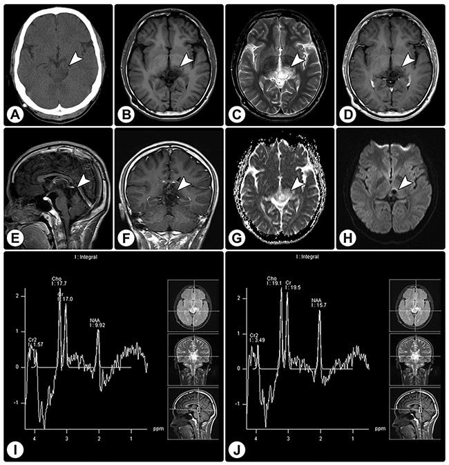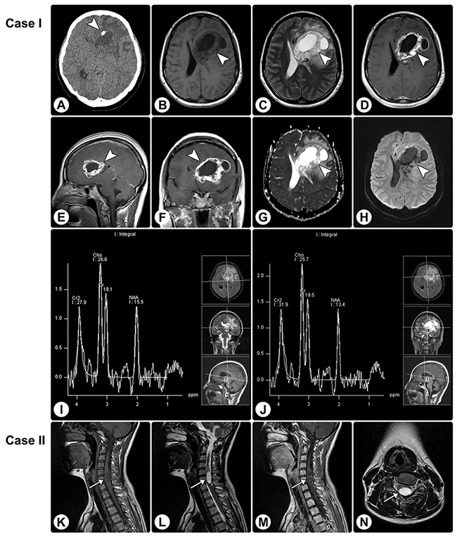 This study was approved by the Institutional Review Board and written informed consent was obtained. We enrolled 38 consecutive patients with RGNTs in the central nervous system from August 2009 and June 2016. RGNTs were diagnosed on the basis of pathological criteria, and all slides from the resected specimens, including those used for immunohistochemistry, were reassessed independently by two neuropathologists. The detailed clinical profiles were documented. The MRI and CT characteristics were analyzed independently by two neuroradiologists.