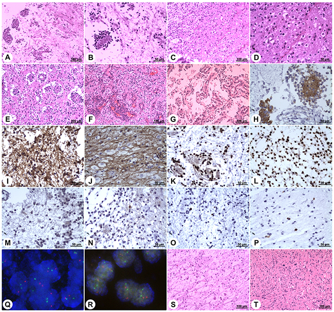Following formalin fixation, paraffin sections of the resected specimens were prepared for hematoxylin and eosin staining and immunohistochemical analysis, including staining for SYN, GFAP, Olig-2, MAP-2, S-100, NeuN, NSE, NF, EMA, and Ki-67. IDH1/IDH2 gene mutations were examined using immunostaining for mutation-specific antibodies to the R132H substitution of IDH1 and the R172G substitution of IDH2 [45]. Additionally, dual-color FISH analysis was performed on 5-μm-thick tissue sections to analyze the codeletion of 1p36 and 19q13, using previously described methods [14].