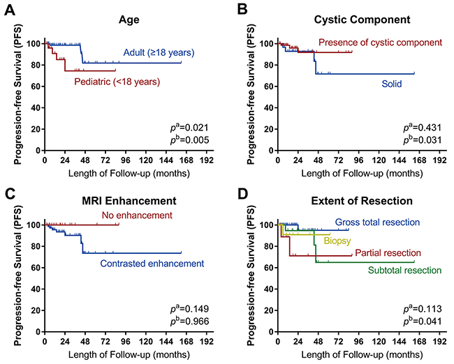 Figure 6: Kaplan–Meier curves. Kaplan–Meier curves of progression-free survival for (A) age, (B) cystic component, (C) MRI contrast enhancement, and (D) extent of resection. pa: the p-value of Log-rank analysis. pb: the p-value of Cox proportion hazard multivariate analysis. Log-rank tests showed that age was significantly associated with the tumor progression. Multivariate analysis showed that pediatric age, absence of cystic components and inadequate resection extent were significantly associated with the tumor progression.