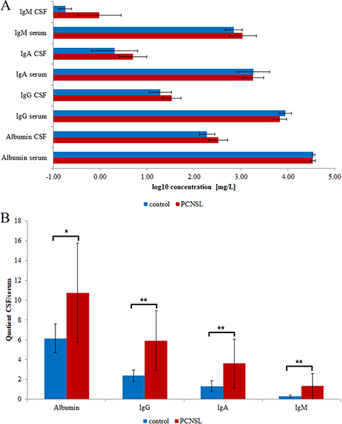 Figure 1: Clinical data of participating individuals. The mean values and corresponding standard deviations are shown. (A) Concentrations of albumin, IgG, IgA and IgM in CSF and serum. (B) CSF/serum concentration quotients of albumin, IgG, IgA and IgM. Significance levels: p < 0.05 (*), p < 0.01 (**).