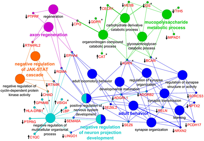 Figure 6: Network enrichment analysis of differentially abundant proteins. In total, 66 proteins were used to generate the network of GO biological processes. Thirty-three proteins (50%) were successfully mapped to 21 unique biological processes. The proteins (gene names) associated with the GO terms are highlighted in red. The direction of alteration is indicated by an arrow, and the occurrence at the proteome or mRNA level is indicated by an asterisk. The color code indicates the group affiliation. The term of each group with the highest significance is shown in bold letters.