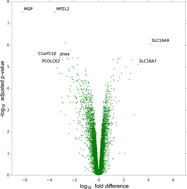 Figure 2: Volcano plot of genes according to the magnitude (fold-difference, x-axis) and significance level (-log10 adjusted p-value, y-axis) of their difference in expression in H1975C5 and H1975C5 cells compared to H1975DM cells from gene expression array analysis.