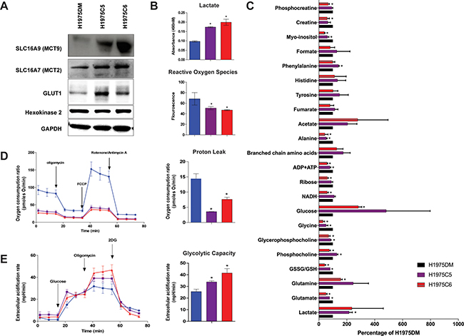 Figure 3: Protein levels and metabolism of H1975DM, H1975C5 and H1975C6 cells. (A) Representative immunoblot of MCT9, MCT2, GLUT1 and Hexokinase 2, and GAPDH as a loading control. (B) Baseline levels of lactate and reactive oxygen species. (C) Baseline metabolite levels according to NMR analysis, relative to levels in H1975DM cells. (D) Kinetic OCR response to oligomycin (for determining ATP coupled respiration), carbonyl cyanide-p-trifluoromethoxy-phenylhydrazone (FCCP) (to establish maximal respiratory capacity) and rotenone (to examine mitochondrial respiration). Proton leak calculation derived from the difference in measurement 12 and measurement 4. (E) Kinetic extracellular acidification rate response to glucose, oligomycin and 2-DG. Glycolytic capacity is the difference between extracellular acidification rate of measurement 9 and that of measurement 3. Displayed are the mean ± SD from triplicate analysis. * indicates p < 0.05, paired t-test.