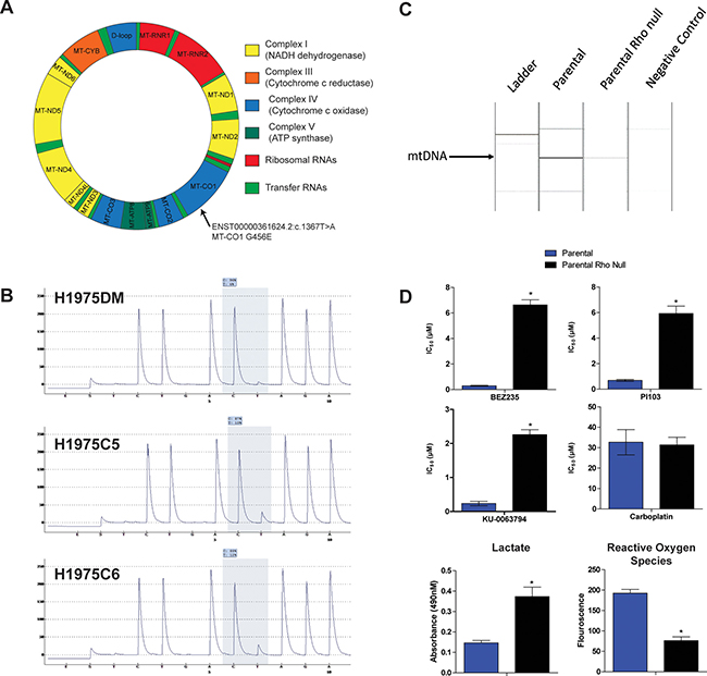 Figure 4: (A) Representation of somatic mitochondrial DNA variants detected only in AQR clones in MT-CO1 gene. (B) Validation of the ENST00000361624.2: c.1367T>A variant by pyrosequencing. (C) PCR verification of ρ(o) status of H1975ρ(o) cells compared with parental H1975 cells. (D) Bar charts showing IC50 values of BEZ235, PI103, KU-0063794 and carboplatin in H1975 (blue columns) and H1975ρ0 (black columns) cells. Also shown are the levels of extracellular lactate and reactive oxygen species in H1975 and H1975ρ0 cells. *p < 0.05, paired t-test.