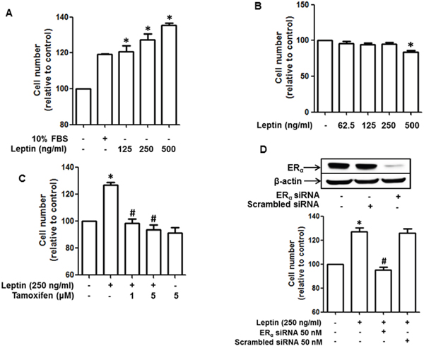 Figure 1: Role of estrogen receptor (ER) signaling in leptin-induced growth of breast cancer cells. (A and B) MCF-7 breast cancer cells (A) and MDA-MB-231 breast cancer (B) cells were treated with the indicated concentrations of leptin for 48 h. Cell viability was determined by MTS assay as described in the Materials and Methods section. Values are presented as mean ± SEM (n=3). (C) MCF-7 cells were pretreated with the indicated concentrations of tamoxifen for 1 h followed by treatment with leptin (250 ng/mL) for an additional 48 h. Cell viability was assessed by MTS assay. Values are presented as mean ± SEM (n=3). (D) MCF-7 cells were transfected with 50 nM of siRNA targeting estrogen receptor-α (ERα) or control scrambled siRNA. (Upper panel) Gene silencing efficiency of ERα siRNA was monitored by Western blot analysis. (Lower panel) Cell viability was determined by MTS assay as described previously. In all experiments, * denotes P < 0.05 compared with control cells and # denotes P < 0.05 compared with the cells treated with leptin but not treated with tamoxifen or transfected with ERα siRNA.
