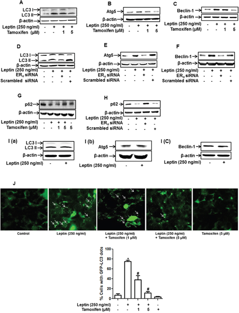 Figure 2: Role of ER signaling in leptin-induced autophagy activation in breast cancer cells. (A-C) MCF-7 cells were pretreated with the indicated concentrations of tamoxifen for 1 h and subsequently stimulated with leptin (250 ng/mL) for 48 h. Protein expression levels of LC3 (A), Atg5 (B), and Beclin-1 (C) were measured by Western blot analysis. Representative images from at least three independent experiments are shown. (D-F) MCF-7 cells were transfected with siRNA targeting ERα. After 48 h of incubation, cells were treated with leptin (250 ng/mL) for 48 h. Protein expression levels of LC3 (D), Atg5 (E), and Beclin-1 (F) were measured by Western blot analysis. Representative images from three independent experiments that showed similar results are shown. (G and H) MCF-7 cells were pretreated with indicated concentrations of tamoxifen for 1 h (G) or transfected with siRNA targeting the ERα (H) as described previously. Cells were then further stimulated with leptin (250 ng/mL) for 48 h. p62 protein expression was measured by Western blot analysis. (I) MDA-MB-231 cells were incubated with leptin (250 ng/mL) for 48 h, and protein expression levels of LC3, Atg5, and Beclin-1 were determined by Western blot analysis. Representative images from three independent experiments are shown. (J) MCF-7 cells were transfected with the plasmids expressing eGFP-LC3. After 36 h of incubation, cells were treated with tamoxifen for 1 h and further stimulated with leptin (250 ng/mL) for 48 h. LC3 puncta, representing autophagosome formation, are indicated by white arrows. Images were captured using an A1 confocal laser microscope. Representative images from three independent experiments are shown along with the quantitative analysis data. Values are represented as percentage of the cells expressing GFP-LC3. * denotes P < 0.05 compared with control cells and # denotes P < 0.05 compared with the cells treated with leptin but not treated with tamoxifen. Values are presented as mean ± SEM (n=3).