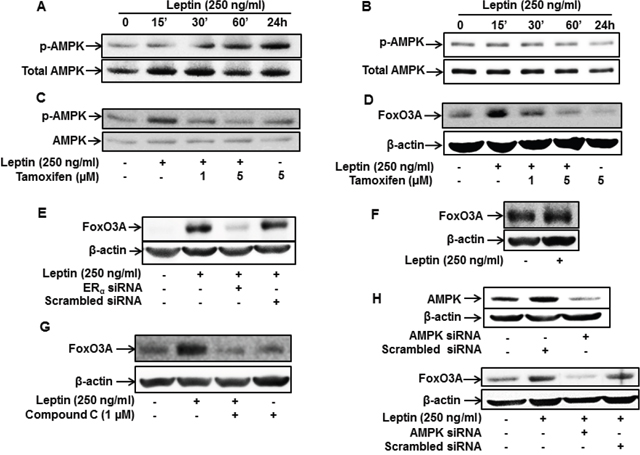 Figure 3: Role of ER signaling in leptin-induced AMPK phosphorylation and FoxO3A expression in MCF-7 cells. (A and B) MCF-7 cells (A) and MDA-MB-231(B) cells were treated with leptin (250 ng/mL) for the indicated time periods. AMPK phosphorylation was determined via Western blot analysis. Representative images from three independent experiments are shown. (C) MCF-7 cells were pretreated with the indicated concentrations of tamoxifen for 1 h, followed by leptin (250 ng/mL) treatment for 24 h. AMPK phosphorylation was measured by Western blot analysis. Representative images from three independent experiments are shown. (D and E) MCF-7 cells were pretreated with the indicated concentrations of tamoxifen for 1 h (D) or transfected with 50 nM of siRNA targeting ERα for 48 h (E) and subsequently stimulated with leptin (250 ng/mL) for 48 h. FoxO3A protein expression levels were determined by Western blot analysis as previously described. Representative images from three independent experiments are shown. (F) MDA-MB-231 cells were incubated with leptin (250 ng/mL) for 48 h. FoxO3A protein expression levels were measured by Western blot analysis. Representative images from three independent experiments are shown. (G) MCF-7 cells were pretreated with Compound C, a pharmacological inhibitor of AMPK, for 1 h followed by treatment with leptin (250 ng/mL) for 48 h. FoxO3A protein levels were determined by Western blot analysis. Representative images from three independent experiments are shown. (H) MCF-7 cells were transfected with siRNA targeting AMPKα or control scrambled siRNA (50 nM). (Upper panel) Gene silencing efficiency of AMPKα was assessed by Western blot analysis. (Lower panel) FoxO3A protein levels were examined by Western blot analysis as previously described. Representative images from three independent experiments are shown.