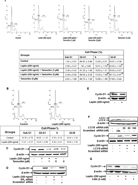 Figure 4: ER signaling and autophagy induction regulate leptin-induced cell cycle progression in breast cancer cells. (A) MCF-7 cells were pretreated with the indicated concentrations of tamoxifen for 1 h followed by incubation with leptin for 48 h. Percentage of the cells in each cell cycle phase was analyzed using fluorescence activated cell sorting (FACS). Average values are obtained from three independent experiments and presented as mean ± SEM (n=3). * P < 0.05 compared with control cells. # P < 0.05 compared with cells treated with leptin but not with tamoxifen. (B) MDA-MB 231 cells were treated with leptin (250 ng/mL) for 48 h. Average values are obtained from three independent experiments and presented as mean ± SEM (n=3). (C and D) MCF-7 cells were pretreated with indicated concentrations of tamoxifen for 1 h (C) or transfected with siRNA targeting ERα for 48 h (D). Cells were further stimulated with leptin (250 ng/mL) for 48 h. Cyclin D1 protein expression was determined via Western blot analysis as previously described. Representative images from three independent experiments are shown. (E) MDA-MB-231 cells were treated with leptin for 48 h. Cyclin D1 protein expression was determined via western blot analysis. Representative images from three independent experiments are shown. (F) MCF-7 cells were transfected with siRNA targeting LC3B or control scrambled siRNA for 48 h. (Upper Panel) Gene silencing of LC3B was monitored by Western blot analysis as previously described. (Lower panel) Following transfection, MCF-7 cells were treated with leptin for 48 h. Cyclin D1 expression was measured by Western blot analysis. Representative images from three independent experiments are shown. (G) MCF-7 cells were pretreated with 3-methyl adenine (3-MA) for 2 h, followed by leptin treatment for 48 h. Cyclin D1 protein levels were finally determined by Western blot analysis as previously described. Representative images from three independent experiments are shown.