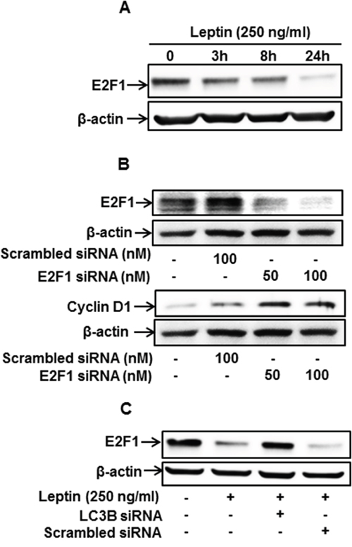 Figure 5: Autophagy induction regulates leptin-induced cyclin D1 expression via modulation of E2F1 in MCF-7 cells. (A) MCF-7 cells were treated with leptin for the indicated time periods. E2F1 protein levels were determined by Western blot analysis. Representative images from three independent experiments are shown. (B) MCF-7 cells were transfected with siRNA targeting E2F1 or control scrambled siRNA for 48 h. (Upper Panel) Gene silencing efficiency of E2F1 was monitored by Western blot analysis. (Lower Panel) Cyclin D1 expression was measured by Western blot analysis. Representative images from three independent experiments are shown. (C) MCF-7 cells were transfected with siRNA targeting LC3B for 48 h, followed by leptin treatment for 48 h. E2F1 protein expression was determined by Western blot analysis. Representative images from three independent experiments are shown.