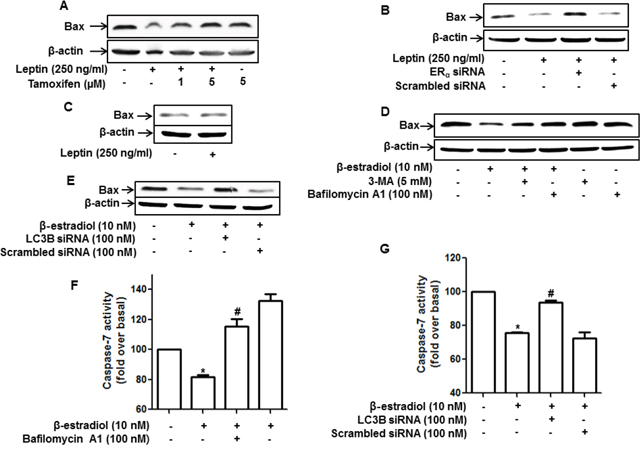 Figure 6: Role of ER signaling and autophagy induction in the regulation of apoptosis and Bax expression in MCF-7 cells. (A and B) MCF-7 cells were pretreated with the indicated concentrations of tamoxifen for 1 h (A) or transfected with ERα siRNA for 48 h (B) and subsequently treated with leptin for 48 h. Bax protein levels were measured by Western blot analysis. Representative images from three independent experiments that showed similar results are presented. (C) MDA-MB-231 cells were treated with leptin for 48 h. Bax protein expression was analyzed via Western blotting. (D) MCF-7 cells were pretreated with 3-MA for 2 h or Bafilomycin A1 for 2 h, followed by stimulation with β-estradiol (10 nM) for 24 h. Bax protein levels were determined by Western blot analysis. Representative images from three independent experiments are shown. (E) MCF-7 cells were transfected with siRNA targeting LC3B for 48 h and further stimulated with β-estradiol for 24 h. Bax protein levels were measured by Western blot analysis. Representative images from three independent experiments are shown. (F and G) MCF-7 cells were pretreated with bafilomycin A1 for 2 h (F) or transfected with siRNA targeting LC3B for 48 h (G), followed by stimulation with β-estradiol for 48 h. Caspase-7 activity was determined as described in the Materials and Methods section. Values are presented as mean ±SEM (n=3). * denotes P < 0.05 compared with control cells. # denotes P < 0.05 compared with cells treated with β-estradiol but not pretreated with bafilomycin or transfected with LC3B siRNA.