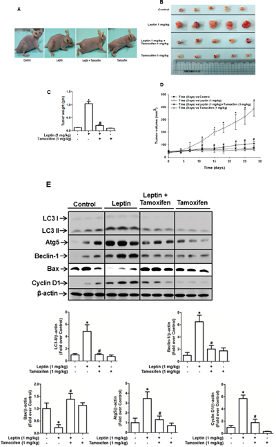 Figure 7: Role of ER signaling in leptin-induced growth of MCF-7 tumor xenograft model. MCF-7 tumor xenograft model was established using 4-week-old BALB/c nude male mice. MCF-7 cells were injected subcutaneously into the rear flank of the mice. After 10 days of subcutaneous injection of MCF-7 cells, mice were randomly divided into the following four groups: control, leptin (1 mg/kg), leptin (1 mg/kg) and tamoxifen (1 mg/kg), and tamoxifen (1 mg/kg) alone. Leptin and tamoxifen were intraperitoneally administered every 36 h and 24 h, respectively, for 4 weeks. (A) Representative images of mice from each group at the end of the treatment. (B) After four weeks of treatment, tumor tissues were collected and represented. (C) Tumor tissues were collected, and the corresponding weights were measured. Values are presented as mean ± SEM (n=5). * P < 0.05 compared to the control mice. # P<0.05 compared to the mice treated with leptin. (D) During treatment, tumor volume was measured twice weekly as described in the Materials and Methods section. (E) Tumor tissues were lysed as indicated in the Materials and Methods section, and protein expression levels of autophagy-related genes, including LC3, Atg5, and Beclin-1, a cell cycle-related gene (cyclin D1), and an apoptotic gene (Bax) were determined in different treatment groups by Western blot analysis. Quantitative analyses of protein expression of LC3, Atg5, Beclin-1, cyclin D1 and Bax were determined by densitometric analysis and shown in the lower panel. Values are presented as mean ± SEM (n=5). * P < 0.05 compared to the control mice. # P<0.05 compared to the mice treated with leptin.