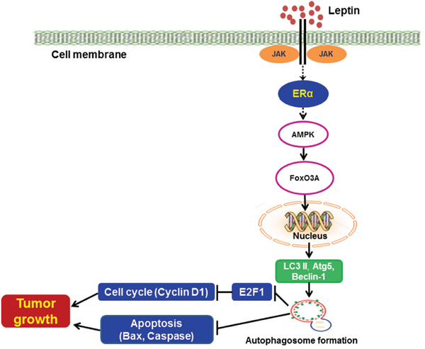 In conclusion, the results from both in vitro and in vivo models clearly demonstrated that ER signaling plays a crucial role in leptin-induced growth of breast cancer cells via autophagy induction. Tumor growth via ER signaling and autophagy induction is mediated via both inhibition of apoptosis and promotion of cell cycle progression. In addition, ER signaling utilizes the AMPK/FoxO3A axis to induce autophagy in leptin-treated breast cancer cells (Figure 8). Results from the present study indicate that suppression of ER signaling and autophagy induction would be a novel strategy that can be used to suppress leptin-induced growth of breast cancer.