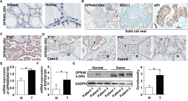 Figure 1: Representative expression of GPR48/LGR4 in human normal thyroid and thyroid carcinomas. (A) Representative images of normal human thyroid gland immunostained for GPR48/LGR4 (brown) and counterstained with hematoxylin, along with 4× enlarged images. Arrows indicate GPR48/LGR4-positive follicular cells. Magnification: 200× and 800×. (B) Representative images of SCNs in human thyroid gland immunostained for GPR48/LGR4, Nkx2.1, and p63. Magnification: 200×. (C) Representative photos of human PTCs immunostained for GPR48/LGR4 (brown) and counterstained with hematoxylin. Magnification: 200×. (D) Representative expression of GPR48/LGR4 in tumors and corresponding normal thyroid tissue of PTCs, along with 4× enlarged images. Magnification: 100×. N, normal tissue; T, tumor tissue. (E) GPR48/LGR4 mRNA levels in total cell lysates acquired from paired clinical specimens of normal (N) and tumor (T) tissues, examined by RT-PCR of specimens from six patients with PTC. (F) RSPO2 mRNA levels in total cell lysates acquired from paired clinical specimens of normal (N) and tumor (T) tissues, examined by RT-PCR of specimens from six patients with PTC. (G) Representative images of immunoblot analysis for detection of GPR48/LGR4 in paired clinical specimens of normal (N) and tumor (T) tissues. *, P<0.05.