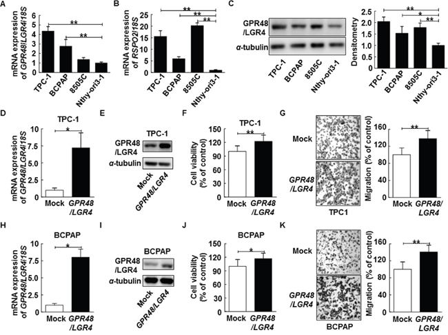 BCPAP and TPC-1 were maintained in Dulbecco’s Modified Eagle’s Medium (DMEM; Invitrogen) [47–49]. Nthy-ori3-1 and 8505C were cultured in RPMI 1640. Both types of media were supplemented with 10% heat-inactivated fetal bovine serum (FBS), 100 U/mL penicillin, and 100 μg/mL streptomycin [47, 48]. Cells were cultured at 37°C in a humidified chamber under a 5% CO2 atmosphere. Transient transfection was performed using the Lipofectamine 2000 reagent (Invitrogen, Carlsbad, CA, USA) when cells reached 60% confluence. The full-length cDNA encoding human GPR48/LGR4 was PCR-amplified from a cDNA library and inserted into the pCMV6-Entry (cat #PS100001) vector purchased from OriGene (Rockville, MD, USA). TPC-1 and BCPAP cells were transfected with 20 pmol Stealth siRNA or siGPR48/LGR4 (Invitrogen, Carlsbad, CA, USA) oligomers in 50 μL Opti-MEM I using Lipofectamine RNAiMAX (Invitrogen, Carlsbad, CA, USA). All experiments were performed in duplicate and repeated at least three times.