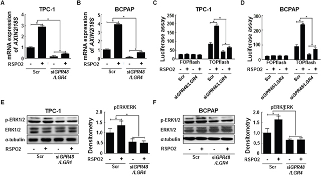Figure 5: RSPO2-GPR48/LGR4 signaling axis in papillary thyroid carcinoma. (A) AXIN2 mRNA levels in TPC-1 cells treated with RSPO2 (100 ng/mL) for 24 hr after transfection with GPR48/LGR4-specific or scrambled siRNA. (B) AXIN2 mRNA levels in BCPAP cells treated with RSPO2 (100 ng/ml) for 24 hr after transfection with GPR48/LGR4-specific or scrambled siRNA. (C) β-catenin signaling in TPC-1 cells transfected with Gpr48/Lgr4-specific or scrambled siRNA in response to treatment with RSPO2 (100 ng/mL), as determined by the luciferase-based TOPflash/FOPflash assay. (D) β-catenin signaling in BCPAP cells transfected with GPR48/LGR4-specific or scrambled siRNA in response to treatment with RSPO2 (100 ng/mL), as determined by the luciferase-based TOPflash/FOPflash assay. (E) Representative images of immunoblot analysis for detection of ERK1/2, phospho-ERK1/2, and α-tubulin in TPC-1 cells treated with RSPO2 (100 ng/mL) for 24 hr after transfection with GPR48/LGR4-specific or scrambled siRNA. α-tubulin was used as a loading control. (F) Representative images of immunoblot analysis for detection of ERK1/2, phospho-ERK1/2, and α-tubulin in BCPAP cells treated with RSPO2 (100 ng/mL) for 24 hr after transfection with GPR48/LGR4-specific or scrambled siRNA. α-tubulin was used as a loading control. ‘Scr’ indicates cells transfected with scrambled siRNA. *, P < 0.05.