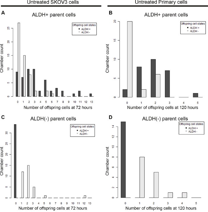 Figure 2: ALDH+ and ALDH(-) cells produce different numbers of offspring in microfluidics chambers. ALDH+ and ALDH(-) SKOV3 cells (A and C) or primary cells (B and D) were grown in microfluidic culture for 72 or 120 hours respectively. Bar graphs indicate the counts for number of microfluidic chambers (Y axis) with the respective number of progeny cells (X axis) that are either ALDH+ (black bars) and ALDH(-) (grey bars). Live, viable cells which produced no offspring resulted in a zero value on the x-axis. Results are representative of at least two analyses per sample.