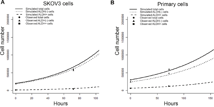 We next assessed the ability of the sampling model to predict the growth of primary cells. We plated 300,000 primary ovarian cells (20% ALDH+ based on FACS), and counted total cell number and ALDH+ percentage after 72 hours. In parallel we used our sampling algorithm assuming 240,000 ALDH(-) and 60,000 ALDH+ cells, as was set up in the in-vitro culture for comparison. Once again, we again observed good agreement between observed and model predicted primary cell numbers andALDH proportion at 72 hours (Figure 4B).