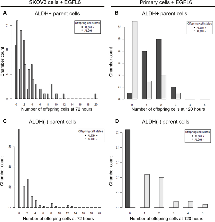 Factors which induce small changes in CSC growth characteristics can significantly alter the growth of bulk cell populations and tumors [38–41]. We next assessed if our microfluidics chip behavior-based modeling schema can predict population growth changes in response to treatment with growth factors. We evaluated the ability of the model to predict the growth changes observed with the exposure of cells to EGFL6. EGFL6 is tumor growth factor produced primarily by tumor endothelial cells [42, 43]. EGFL6 is of particular interest as it acts primarily on ALDH+ cells [39]. We repeated the microfluidic growth assay with ALHD+ and ALDH(-) SKOV3 cells or primary ovarian cancer cells in the presence of absence of EGFL6. After 72 hours, the number and type of daughter cells (ALDH(-) or ALDH+) were scored as described above (Figure 5). EGFL6 treatment was associated with an expansion of ALDH(-) cell self-renewal, with more ALDH(-) cells produced by ALDH(-) parents in both cell line and control cells.