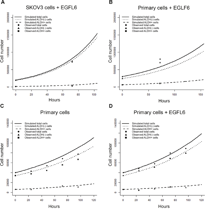 We also evaluated the ability of our algorithm to accurately track primary cells grown with EGFL6 over repeated time points. We ran simulation experiments for primary ovarian cancer cells grown in control media or with treatment with EGFL6. Here we gathered validation measurements on ALDH+ and ALDH(-) cell number experiments every 24 hours for 4 days (Figure 6C, 6D). We again saw good prediction of the validation output by our model, particularly in the ALDH+ cell pool.