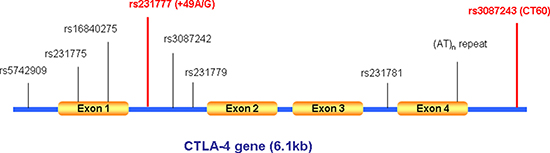 Figure 1: The human CTLA4 gene structure and known polymorphisms.