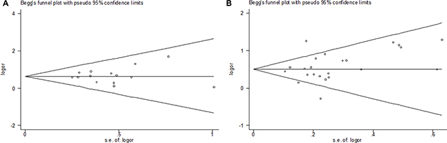 Figure 4: Funnel plot analysis to detect publication bias. Each point represents a separate study for the indicated association. (A) Begg’s funnel of publication bias test for SNP rs3087243: [(GG+GA) vs. AA)]; (B) Begg’s funnel of publication bias test for SNP rs231775: [GG vs. (GA+AA)].