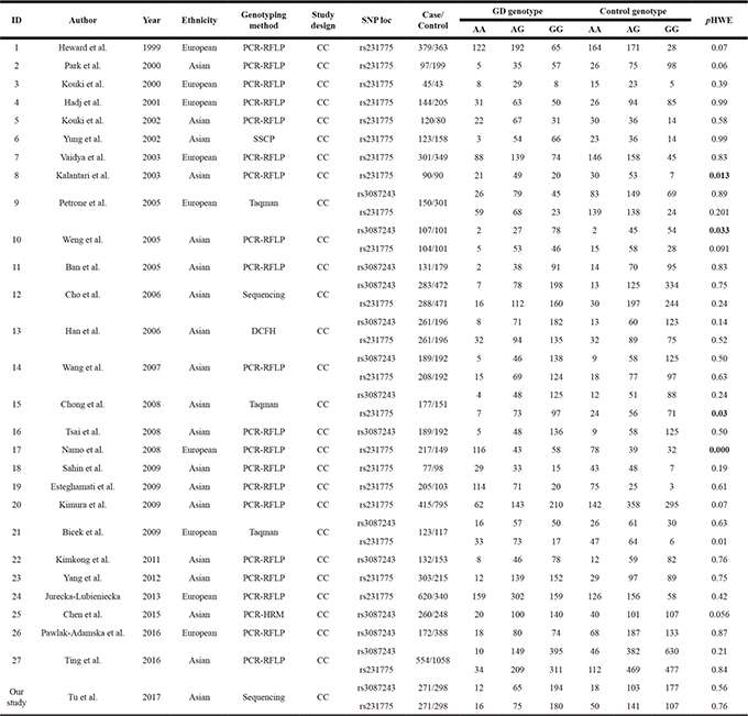 PubMed, EMBASE and ISI Web of Science were searched (the last search was conduct on March 1, 2017) using the following search terms: “CTLA4” or “Cytotoxic T-Lymphocyte-Associated Antigen 4” and “Graves’ disease” and “polymorphism”. Reference, which were listed in each identified article, were also searched manually to identify additional eligible studies. To be eligible, the following inclusion criteria were established: (1) a human case–control study of a polymorphism associated with Graves’ disease; (2) studies that included sufficient genotype data for extraction. Main exclusion criteria of studies were as follows: (1) case reports, letters, reviews, and editorial articles; (2) literature not containing information regarding Graves’ disease research; (3) study involving only a case population; and (4) study not written in English. In the case of multiple studies by the same researchers involving the same or overlapping data sets, we selected the most recent study with the largest number of participants.