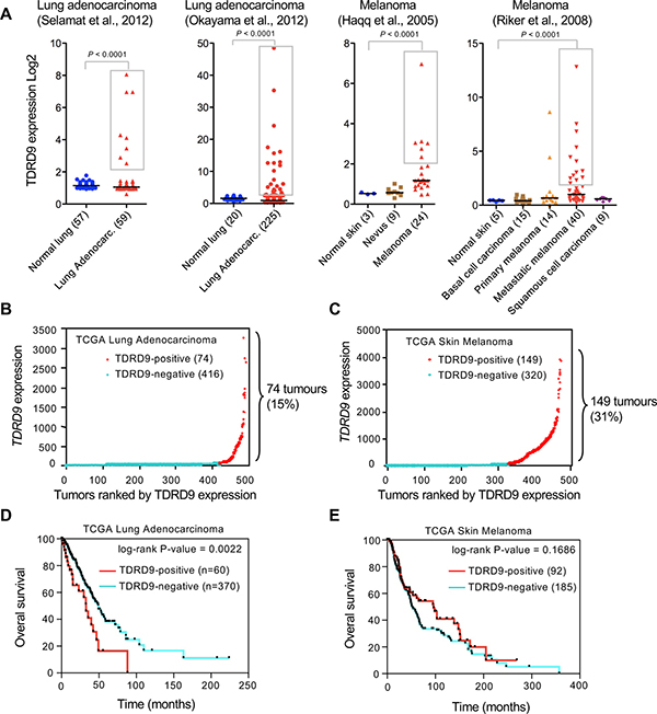 Figure 1: TDRD9 expression in lung adenocarcinoma and skin melanoma. (A) Analysis of TDRD9 expression in lung adenocarcinoma and skin melanoma. Data were obtained from the indicated sources through ONCOMINE. Statistical significance value for Student’s t-test is P < 0.0001. (B, C) RNA-seq expression data (RSEM normalized) from lung adenocarcinoma (TCGA-LUAD) (B) and skin melanoma (TCGA-SKCM) cohorts (C). (D, E) Kaplan-Meier survival plots for TCGA-LUAD patients (D) and TCGA-SKCM patients (E). P values were calculated by log-rank test. Data obtained from The Cancer Genome Atlas (TCGA). (B-E) TDRD9-positive tumors are shown in red; TDRD9-negative tumors are shown in blue.