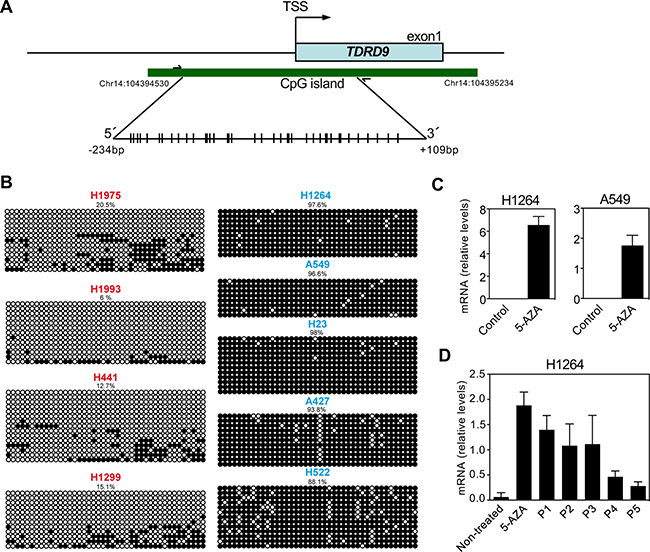 Figure 3: DNA methylation profile of the CpG island of TDRD9 promoter. (A) Schematic diagram of the CpG island of TDRD9 promoter (-287 to +417 with respect to the transcription start site (TSS)). Amplified region for determination of DNA methylation (-234 to +109) is also shown. CpG pairs are represented by sticks. (B) Determination of DNA methylation by bisulfite conversion and sequencing of a region (-234 to +109 respect to the TSS) of the TDRD9 CpG island from different lung carcinoma cell lines. Open circles denote unmethylated CpGs, and filled circles represent methylated CpGs. Eight to fourteen independent clones of each sample were sequenced. (C) Relative mRNA expression levels of TDRD9 gene by RT-qPCR in TDRD9-negative lung carcinoma cell lines (H1264 and A549) after the treatment with 5-aza-2´-deoxycytidine for 72 hours. (D) Re-silencing of TDRD9 gene expression in the H1264 cell line following of 5-aza-2´-deoxycytidine removal. Cells were treated with 5-aza-2´-deoxycytidine for 72 hours and then washed and cultured in the absence of the drug. Cells were passed 1:3 dilution every three days, and samples were taken at the indicated passage (P) for RNA isolation. Data are the mean of at least n = 6 qPCR reactions from three independent experiments. Error bars represent ± SD values.