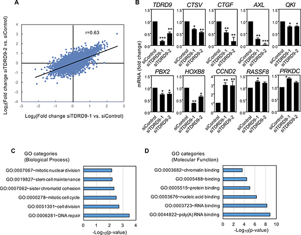 Figure 5: Characterization of transcriptional changes caused by TDRD9 knockdown in the lung adenocarcinoma cell line H1993. (A) Correlation between the results obtained after knockdown of TDRD9 using two different siRNAs (Pearson coefficient, r = 0.634; P < 0.0001). (B) Effect of TDRD9 knockdown on the expression of the indicated genes. Expression levels of TDRD9 were determined as a control. mRNA levels were determined by RT-qPCR. Data are the mean of at least n = 6 qPCR reactions from three independent experiments. Error bars represent ± SD values. Significance respect to the siControl was tested by using Student’s t-test. *P < 0.05; **P < 0.01; ***P < 0.0001. (C) Biological process-GO categories enriched in genes upregulated after TDRD9 knockdown. (D) Molecular function–GO categories enriched in genes upregulated after TDRD9 knockdown. Bonferroni-corrected P values were -log10 transformed.