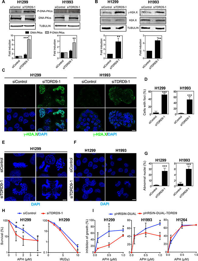 Expression of several genes involved in the DNA damage response was increased upon TDRD9 depletion (Table 1). In particular, the expression of PRKDC, which encodes the catalytic subunit of the DNA activated protein kinase (DNA-PKcs), was upregulated in TDRD9-silenced cells. DNA-PK is a central regulator of the response to double strand breaks that catalyzes the phosphorylation of histone H2A.X on Ser139 (γH2A.X). γH2A.X helps to recruit repair factors to double strand breaks [28] and coordinates the signal transduction cascades required for efficient repair [29]. Furthermore, DNA damage often blocks the progression of the DNA replication machinery and causes S-phase arrest, a phenotype observed in TDRD9-depleted cells. Therefore, we decided to investigate whether a reduction in the level of TDRD9 causes an increase of double-strand breaks (DSBs), as manifested by an increased level of activated DNA-PKcs (phospho-DNA-PKcs) and γH2A.X signals. As shown in Figure 6, siTDRD9-1-treated H1993 and H1299 cells presented increased levels of phospho-DNA-PKcs, as determined by Western blotting (Figure 6A). Consistently, a strong increase in the γH2A.X signal was also detected by both Western blotting (Figure 6B) and immunofluorescence (Figure 6C and 6D) in both cell lines. We also observed that TDRD9-depleted cells presented frequent aberrant mitosis and DNA bridges during anaphase (Figure 6E), indicative of a defective chromosomal segregation, which can originate from defects in DSB repair [30]. Finally, frequent abnormally-shaped nuclei were also found (Figure 6F and 6G), which is also a hallmark of defective chromosomal segregation [31, 32]. Therefore, we hypothesized that TDRD9 protects cells from DNA damage in TDRD9-positive lung carcinoma cells. Replicative stress is a common source of DNA damage in tumor cells [33]. In order to investigate whether TDRD9 is related to replicative stress, we have determined the sensitivity of TDRD9-depleted cells to the replication stress inducer aphidicolin. Cells treated with siTDRD9.1 were hypersensitive to aphidicolin as compared to control cells (Figure 6H left panel). The non-linearity in the clonogenic survival plot of data from depleted-cells (Figure 6H, red) is indicative of the existence of a mixed population, probably as a consequence of differential silencing of TDRD9 in the siTDRD9-treated culture. In contrast, TDRD9-depleted cells were not hypersensitive to ionizing radiation (Figure 6H right panel). We next investigated whether an additional increase of the amount of TDRD9 protected cells from replicative stress caused by aphidiolin. Interestingly, overexpression of TDRD9 in the TDRD9-positive H1299 and H1993 cell lines increased resistance to the drug (Figure 6I). However, TDRD9 overexpression did not have any significant effect in the TDRD9-negative cell line H1264 (Figure 6I). Taken together, our data suggest that TDRD9 plays a role in protecting a subset of lung cancer cells from replicative stress.