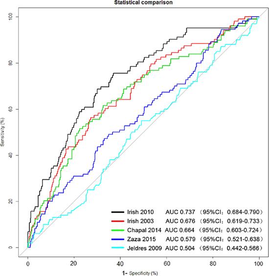 To evaluate the predictive power of the five models (Irish 2010 [13], Irish 2003 [14], Chaphal 2014 [12], Zaza 2015 [16], Jeldres 2009 [15]) for the DGF risk after deceased donor kidney transplantation for Chinese population, the medical records of 713 patients receiving solitary renal transplantation using deceased donors from organ donation after brain death (DBD) and circulatory death (DCD) [32] in the First Affiliated Hospital, Sun Yat-sen University between February 2007 and August 2016 were retrospectively reviewed. No organs from executed prisoners were used. Two patients without the record of DGF status were excluded from the analysis. In addition, the patients were screened for the validation cohort of the five models according to their own inclusion criteria (Supplementary Table 1, Supplementary Figure 1). In the analysis for the Irish 2010 model and Irish 2003 model, the recipients aging < 16 years were excluded, while the recipients aging < 18 years were excluded in the other models. This study was approved by the institutional review board of the First Affiliated Hospital of Sun Yat-sen University.