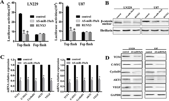 Figure 5: MiR-19a/b abrogation represses the β-catenin/Tcf-4 transcriptional activity. (A) LN229 and U87 cells were co-transfected with Top/Fop and miR-19a/b inhibitors or RUNX3, after which luciferase reporter assays were performed. (B) Western blot detection of β-catenin 48 h following transfection with AS-miR19a/b and RUNX3 in both cell lines. (C, D) Real-time PCR and western blot detection of TCF4, C-MYC, CyclinD1, AKT1 and VEGF 48 h following transfection of LN229 and U87 cells with AS-miR19a/b. *p < 0.05 compared with control group.