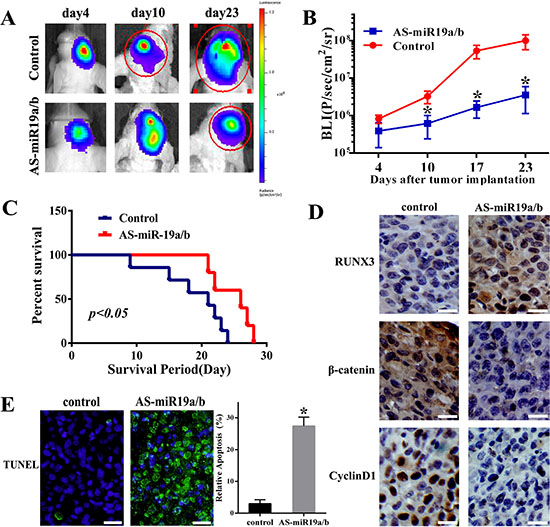 Figure 6: Knockdown of miR-19a/b expression suppresses U87 tumor growth in vivo. (A) U87 cells pretreated with a lentivirus containing luciferase reporter or cotransfection of miR-19a/b inhibitors were implanted in the right forebrain of nude mice, and tumorigenicity was analysized by bioluminescence imaging. Tumor formation assessed by bioluminescent signal were examined at day 4, 10, 23 after tumor implantation. (B) Tumor growth curves were analyzed. The data are described as mean ± SD. *p < 0.05. (C) Overall survival was determined by Kaplan-Meier analysis, and log-rank test was used to evaluate the statistical of the differences. (D) At the end of experiment, Immunohistochemistry was used to assess the expression of RUNX3, β-catenin and CyclinD1 in tumor sections between control and AS-miR-19a/b group. (E) TUNEL analysis on intracranical tumor sections indicating more apoptotic cells compared with control group. *p < 0.05.