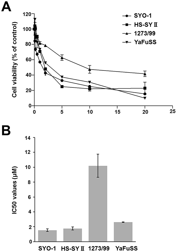 To verify the sensitivity of synovial sarcoma cells to pazopanib, the four synovial sarcoma cell lines, namely SYO-1, HS-SYII, 1273/99, and YaFuSS, were treated with various concentrations of pazopanib for 72 h, and cell viability was determined. The percentage of surviving cells decreased in a dose-dependent manner in all the cell lines (Figure 1A). The 1273/99 cell line was more resistant to pazopanib than the other three cell lines. The 72-h half maximal inhibitory concentrations (IC50) of pazopanib for the SYO-1, HS-SYII, 1273/99, and YaFuSS cells were 1.41 ± 0.19, 1.92 ± 0.22, 10.3 ± 1.45, and 2.59 ± 0.05 μM, respectively (Figure 1B).