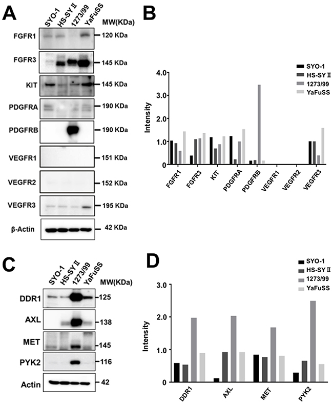 Figure 2: Protein expression levels of targets of pazopanib and other TKs that were differentially expressed in pazopanib-resistant cells. All TK antibodies were used to detect the protein expression levels of 90 TKs in four synovial sarcoma cell lines. The expression levels of targets of pazopanib are shown as (A), and the relative intensity is shown as a bar graph (B). The other TKs that were differentially expressed (fold change > 1.5) in the pazopanib-resistant cells than other cells are shown as (C), and the relative intensity is shown as a bar graph (D).