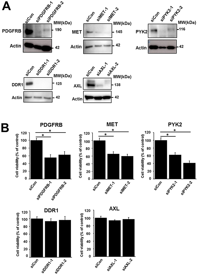 Figure 3: Effect of siRNA-mediated gene silencing of upregulated TKs on proliferation of the 1273/99 cell line. Validation of knockdown effect of siRNA by western blotting (A). Effect of siRNA-mediated gene silencing of PDGFRB, MET, PYK2, DDR1, and AXL on cell proliferation. Cell viability was measured after 72 h (B).