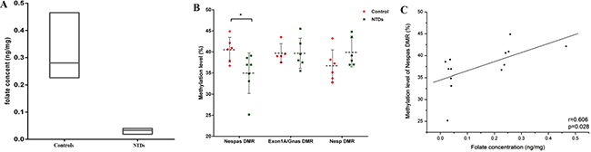 Figure 1: Loss of imprinting in the GNAS gene cluster in human fetuses with neural tube defects (NTDs) was associated with lower folate concentrations. (A) Folate concentrations in NTDs and controls. (B) comparison of methylation levels of three DMRs in the GNAS gene cluster between NTDs and controls, *P < 0.05. (C) correlation between folic acid and methylation levels of the Nespas DMR in human fetal brains.