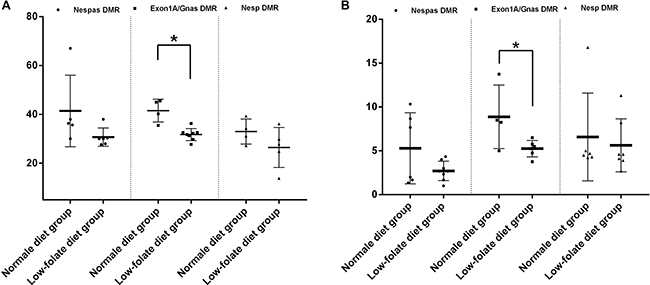 One of the most important regions for fetal development is the GNAS imprinting cluster, which is well conserved between the human and mouse. Three differentially methylated regions (DMRs) have been found in the GNAS imprinting cluster: an extensive germline maternally methylated region at the Nespas promoter (Nespas gDMR); a germline maternally methylated region at the Exon1A promoter (Exon1A/GNAS gDMR); and a paternally methylated region spanning the Nesp promoter (Nesp DMR) [29, 30]. GNAS encodes the alpha subunit of a major heterotrimeric G-signaling protein, which is active in fetal growth and development [31, 32]. GNAS knockout mice show an imprinting defects phenotype, with an increased insulin sensitivity and adipocyte hypertrophy in the null animals [26]. Data from studies on placentas gene expression in samples from pregnancies with IUGR have demonstrated down regulation of GNAS [33–35], however, there is no prior studies conducted to elucidate whether the GNAS imprinting cluster plays a role in periconceptional folate deficiency-related IUGR.