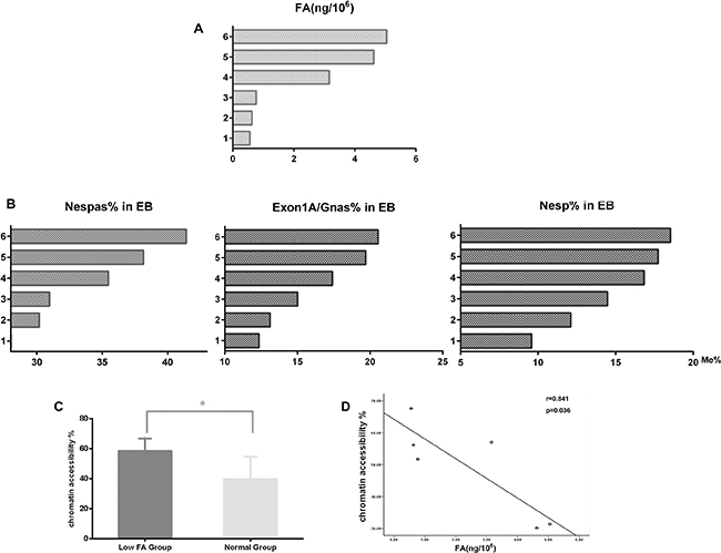 Results from previous studies suggest that alternation in chromatin structure surrounding specific genes might be responsible for gene silencing caused by hypomethylation. To test this hypothesis, assays on chromatin structure were conducted to compare differences in chromatin accessibility within GNAS imprinting cluster in EBs between the FF and FN groups. As shown in Figure 4C, an increased chromatin accessibility accompanied with a decreased methylation level of Exon1A/GNAS was evident in the FF group compared with the FN group (58.48% in FF vs, 39.51% in FN; P < 0.05). Chromatin accessibility was negatively correlated with folic acid levels in EBs (Figure 4D, r = 0.841; P = 0.036).