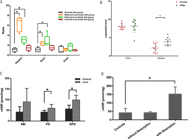 Figure 5: Expression level of genes controlled by the hypomethylated maternal gDMRs in mouse fetal brains. (A) The expression levels of Nespas, Exon1A and GNAS in fetal brains. The values are means ± SDs. *P < 0.05 by Student’s t-test. (B) The expression levels of Nespas and GNAS in human NTDs brain tissues. The values are means ± SDs. *P < 0.05 by Student’s t-test. (C) cAMP levels in fetal brains with folic acid deficiency. *P < 0.05. (D) cAMP levels in fetal brains with folic acid deficiency in the MD group with/without embryo resorption. *P < 0.05.