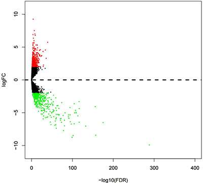 Figure 1: Volcano plot of differentially expressed lncRNAs (DELs) in kidney renal papillary cell carcinoma (KIRP). DELs filtered using the edgeR package with Padj < 0.05 and |log2FC| > 2. Volcano plot was drawn by the gplots package.