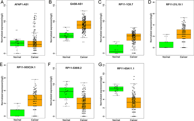 Figure 3: Different expression of the seven lncRNAs between kidney renal papillary cell carcinoma (KIRP) and normal tissues. The boxplots were generated by R language. Statistical differences were analyzed using the two-sample t-test. Green column indicated normal tissue and dark yellow column showed KIRP tissues. (A) AFAP1-AS1; (B) GAS6-AS1; (C) RP11-1C8.7; (D) RP11-21L19.1; (E) RP11-503C24.1; (F) RP11-536I6.2; (G) RP11-63A11.1.
