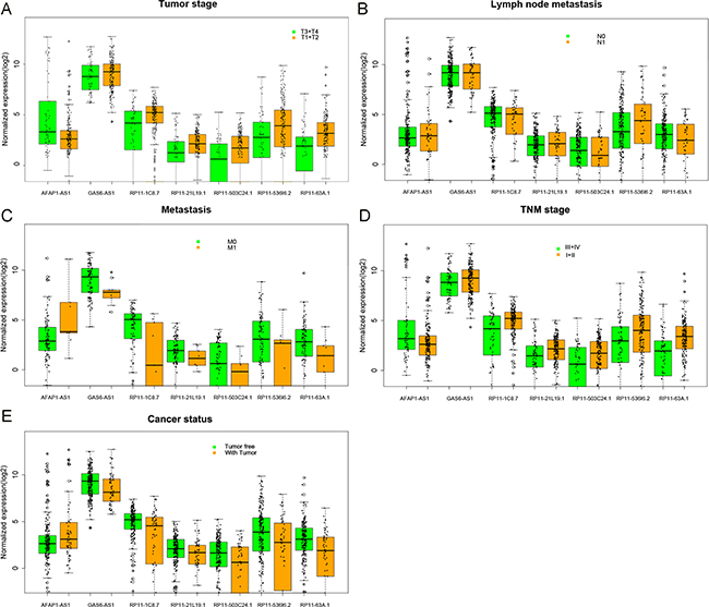 Figure 4: The relationship between the expression of major lncRNAs and clinical pathological features in kidney renal papillary cell carcinoma (KIRP). The boxplots were drawn by R language. Statistical differences were analyzed by the two-sample t-test. These major lncRNAs statistical significance differences were noted in several clinical pathological features: (A) tumor stage (T3/T4 vs. T1/T2), (B) lymph node metastasis (N0 vs. N1), (C) distant metastasis (M0 vs. M1), (D) TNM stage (III/IV vs. I/II), and (E) cancer status (tumor free vs. tumor). The X axis shows different lncRNAs, and the Y axis indicates the normalized expression (log2).