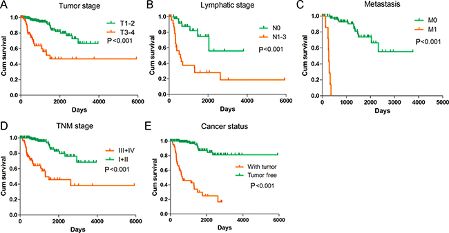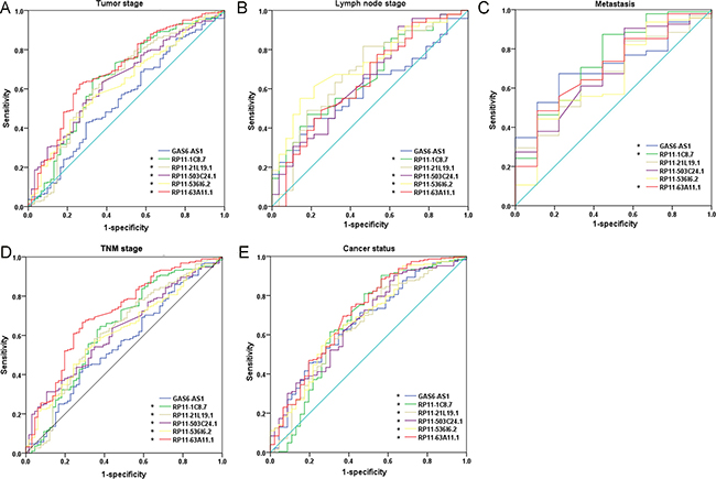 Figure 5: The predictive effect of lncRNAs on clinical progression of kidney renal papillary cell carcinoma (KIRP) by receiver operating characteristic (ROC). The ROC curves were generated by SPSS and used to estimate the predicted value of each lncRNA for the cancer progress including: (A) advanced tumor stages (T3–4), (B) lymph node metastasis positive, (C) metastasis, (D) higher TNM stages (III–IV), and (E) cancer status (with tumor). *P < 0.05 for AUC of each lncRNA.