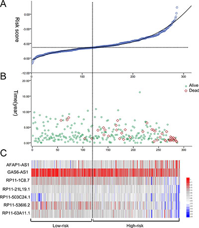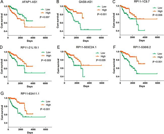 For the present, the clinical implications and mechanisms of lncRNAs in other diseases appeal to our research team. By literature research, of the seven lncRNAs, we only retrieved reports on AFAP1-AS1 and GAS6-AS1 in other diseases, whereas reports were lacking on RP11-1C8.7, RP11-21L19.1, RP11-503C24.1, RP11-536I6.2, and RP11-63A11.1. It was thus necessary to conduct in-depth investigation.