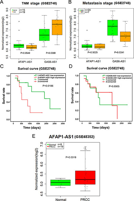 A total of 67 series were retrieved from GEO DataSets according to the search term. Finally, only GSE2748 and GSE48352 were found to contain AFAP1-AS1 or GAS6-AS1 expression. The expression level of AFAP1-AS1 from GSE48352 was higher in papillary renal cell carcinoma (PRCC) than in that of normal controls (P = 0.0318) (Figure 14E). The GAS6-AS1 statistical significance differences were noted in the TNM stage (III/IV vs. I/II) and distant metastasis (M0 vs. M1) (all P < 0.05) (Figure 14A, 14B). AFAP1-AS1 could be used as a prognostic factor, and GAS6-AS1 might be a protective factor in PRCC (Figure 14C, 14D). These results conformed to our previous findings based on TCGA.